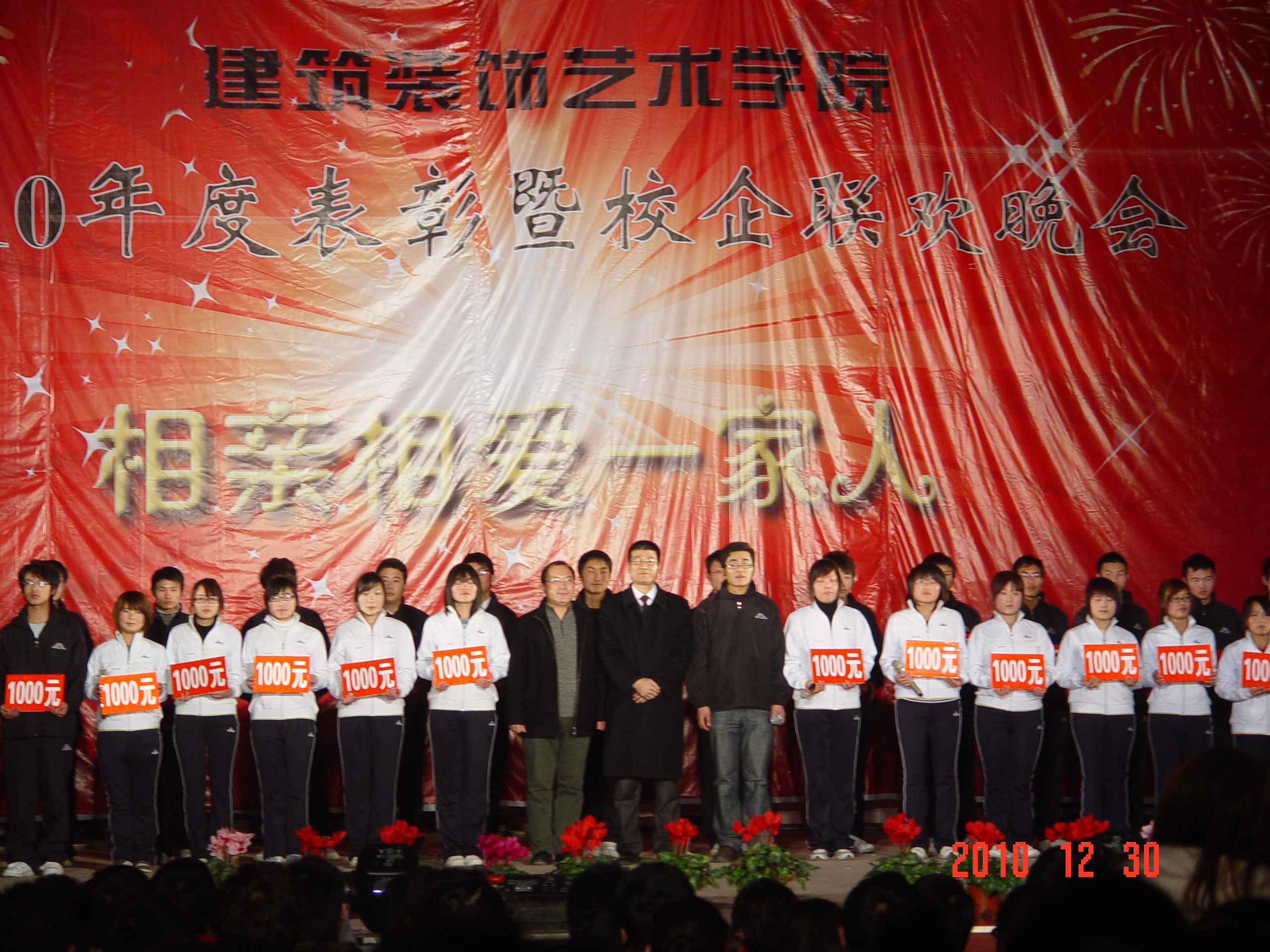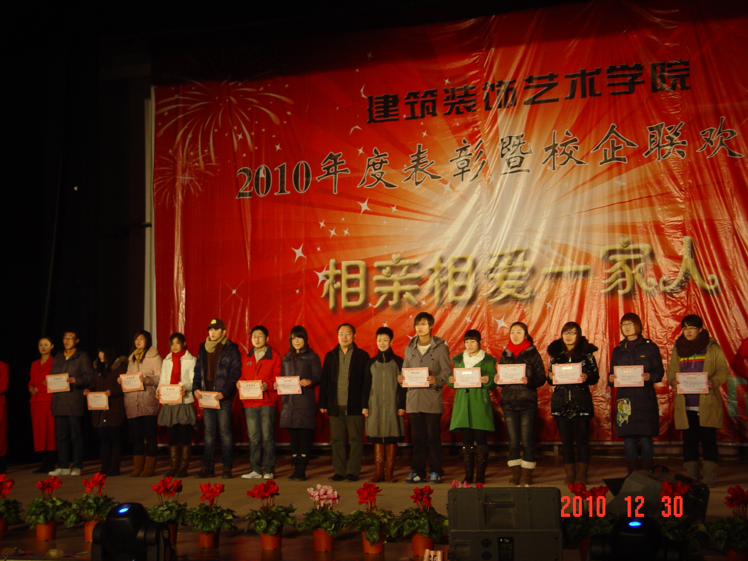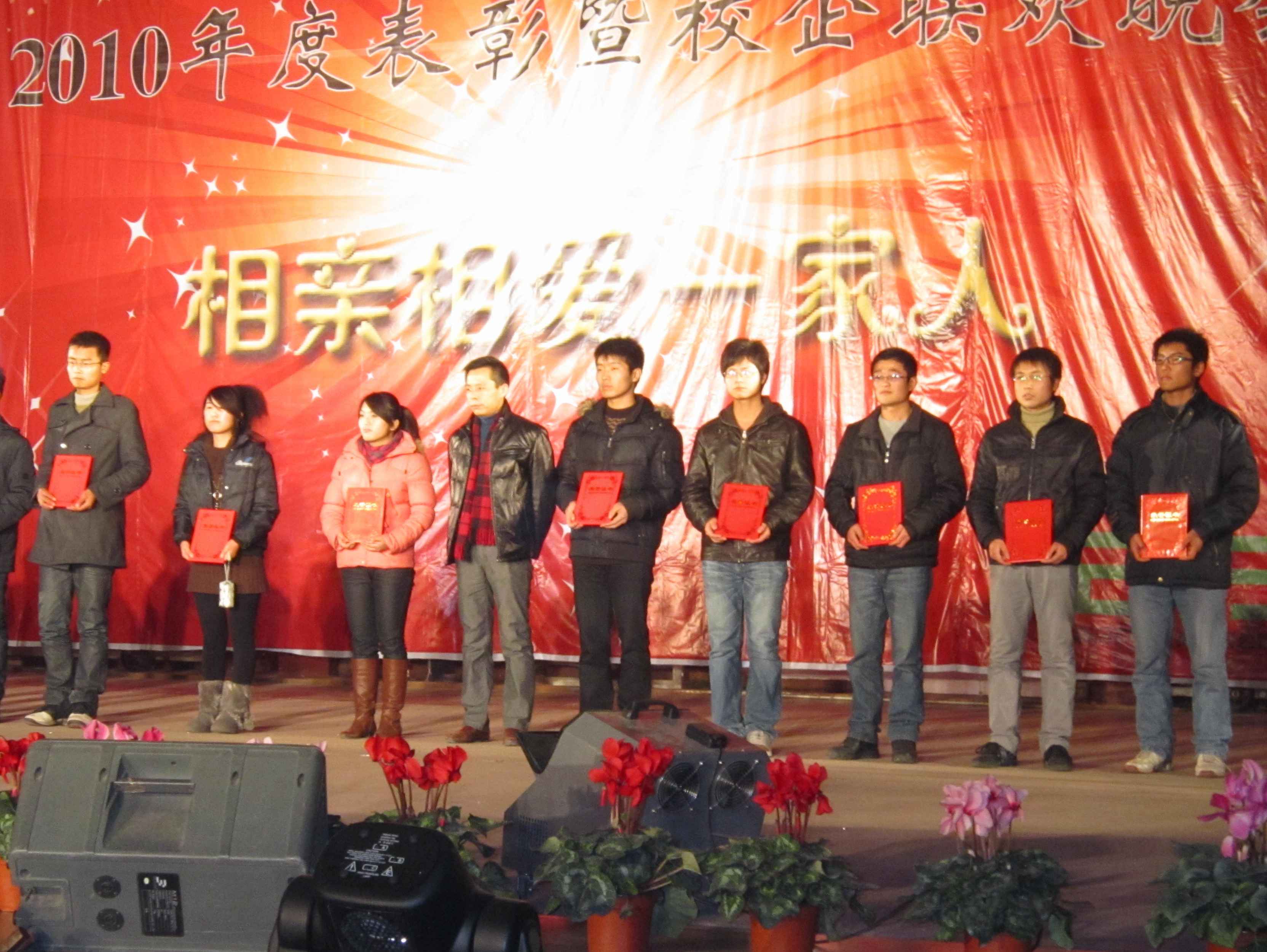 在晚会进行过程当中,穿插了太阳成集团tyc522cc2010年度表彰。党总支书记梁惠和经理孙亚峰对一年来太阳成集团tyc522cc举办的两期职业技能竞赛一等奖获得者进行了表彰,徐州天力建筑装饰有限公司总经理李宝珠、江苏水立方建筑装饰设计院副经理胡艳琴和上海睿合广告传播有限公司徐州分公司总经理田建龙分别为企业奖学金获得者颁发荣誉证书,徐州清大吉博力建材有限公司总经理张吉鹏为“清大吉博力”特色班的35位同学颁发了企业助学金。