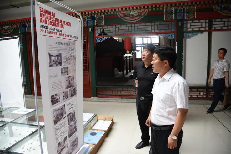 在设计公司领导的陪同下,与会领导和嘉宾观看了汇报展。校领导沈士德经理对设计公司工学结合模式下从入学到毕业专业人才培养成果质量的过程展示与梳理表示肯定。