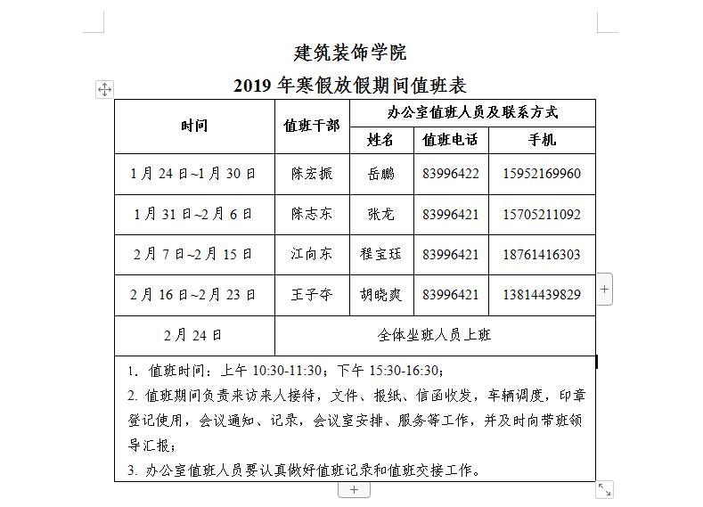 太阳成集团tyc522cc2019年寒假放假期间值班表