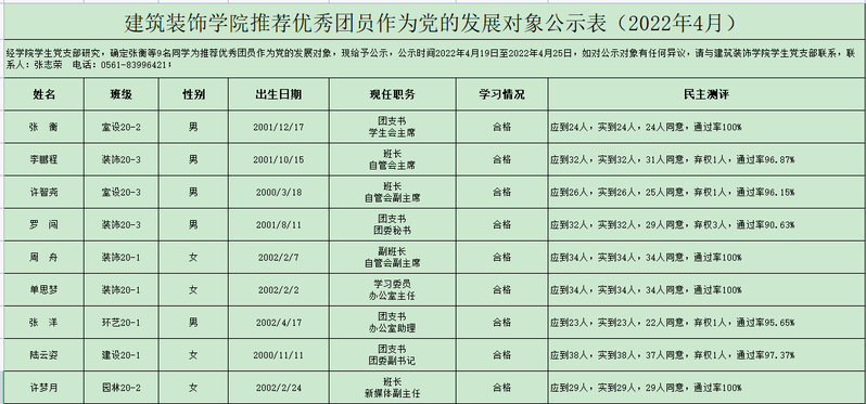 太阳成集团tyc522cc推荐优秀团员作为党的发展对象公示表(2022年4月)