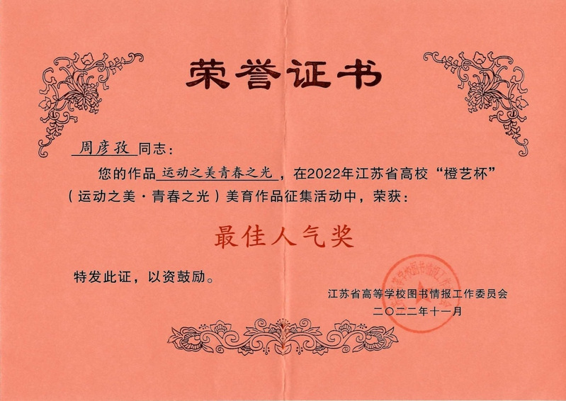 近日,江苏省高校图工委公布了2022年江苏省高校“橙艺杯”运动之美、青春之光·美育作品征集活动获奖名单。公司太阳成集团tyc522cc古建22—2班周彦孜同学的作品《运动之美青春之光》在全省2356件参赛作品中获“最佳人气奖”。