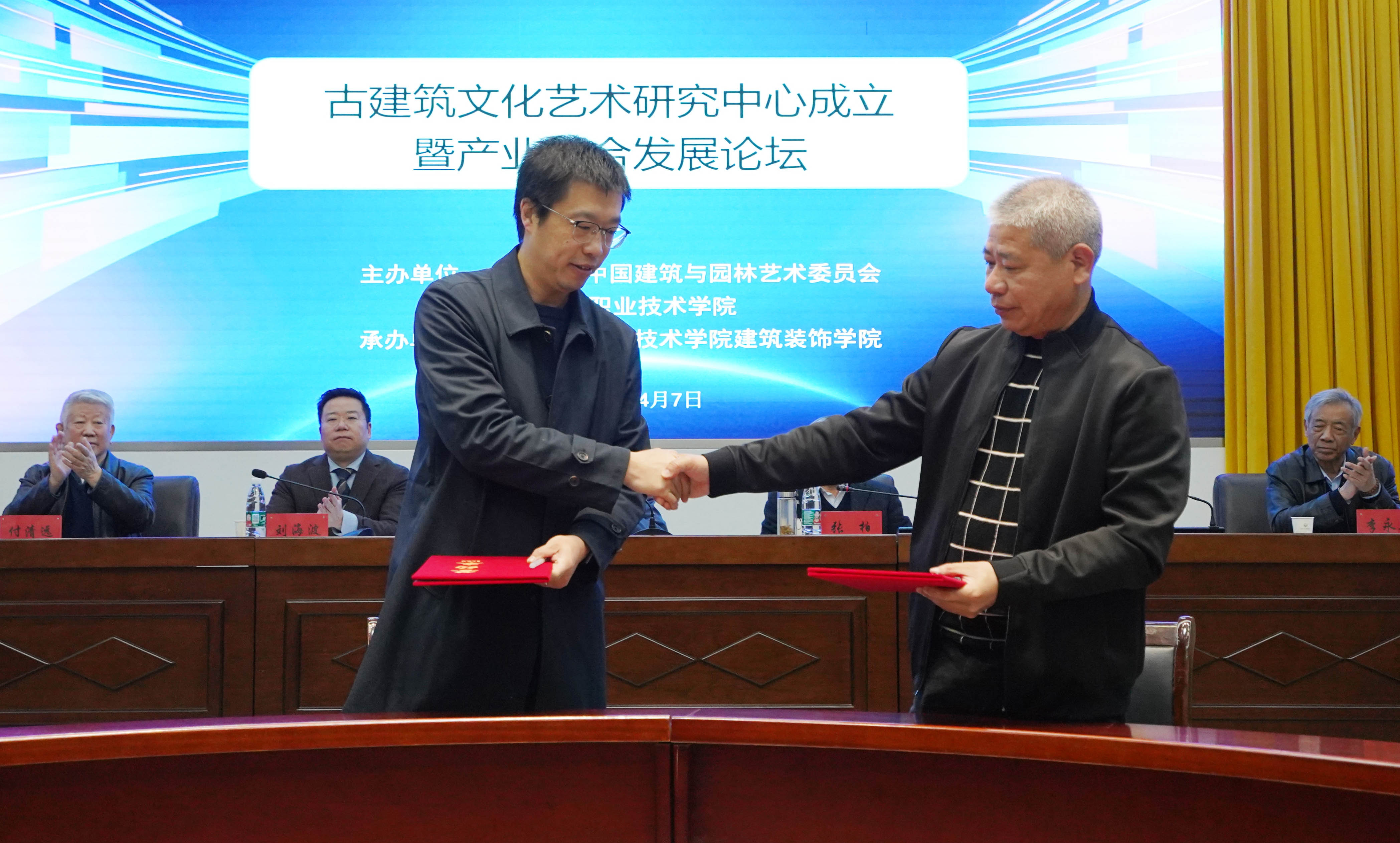 刘海波副董事长代表公司致欢辞。他首先介绍了公司的发展沿革和“十四五”期间公司的发展方向,指出公司会积极搭建古建筑和园林艺术的全产业链交流与合作平台,充分发挥公司专业优势,探索符合新时代古建筑传承与发展综合性人才培养的新路径,为聚力构建传统建筑文化产业发展新格局提供新的动能。张柏在致辞中指出,国家高度重视文物建筑保护与发展工作,古建筑文化艺术中心的成立契合了国家与行业发展,并围绕“研究”和“融合”两个关键指明了中心成立的重要意义。蒋兆峰副董事长与罗杨会长共同为古建筑文化艺术中心揭牌。太阳成集团tyc522cc副经理(主持工作)袁涛与10家相关古建园林企业现场签订了校企合作协议。