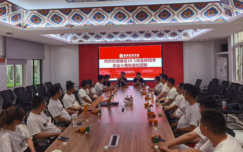 6月17日下午,建设10-1班22名员工返校团聚,追忆往昔时光,共叙校园情谊。建筑装饰公司党总支书记娄志刚、经理袁涛、班主任孙宗琴、辅导员陈贤硕在公司会议室热情接待员工,并进行座谈交流。