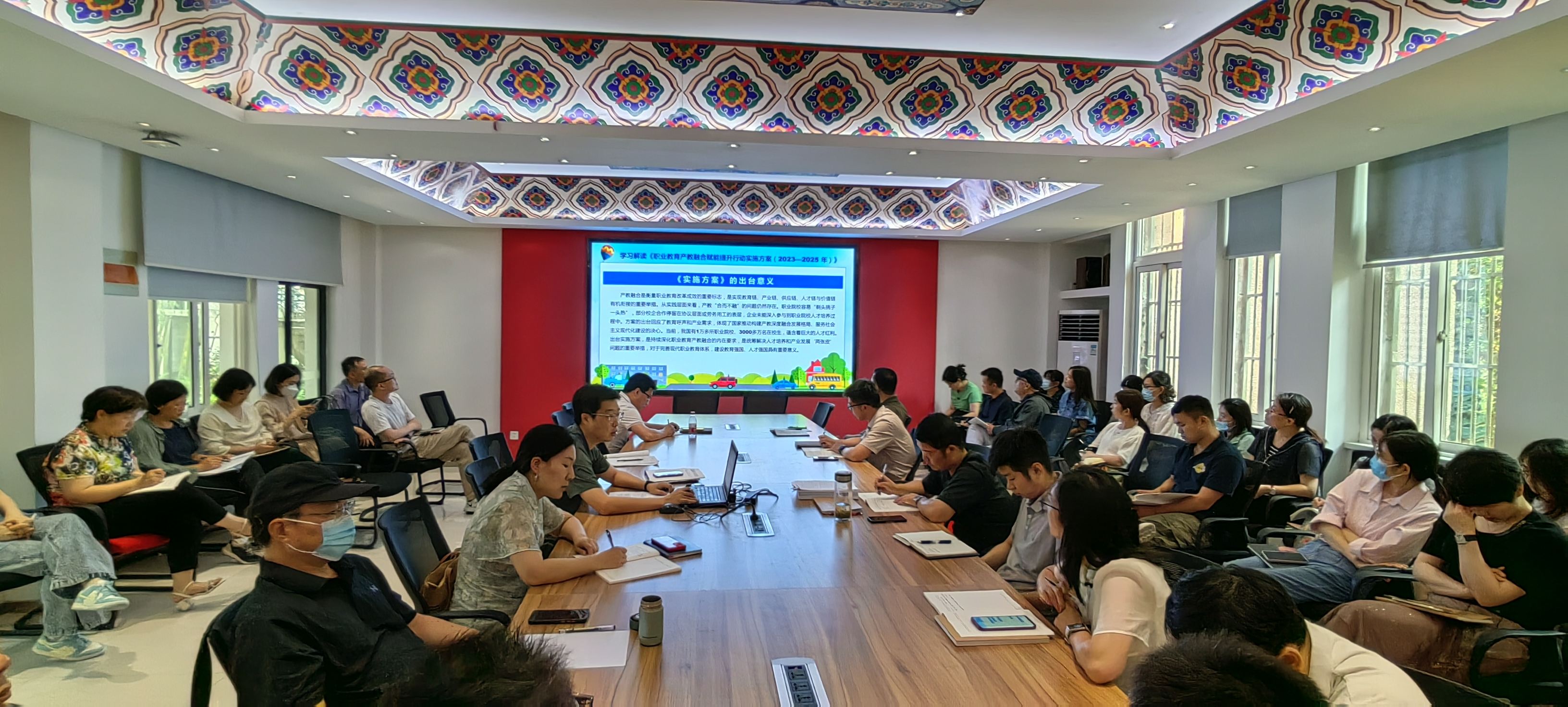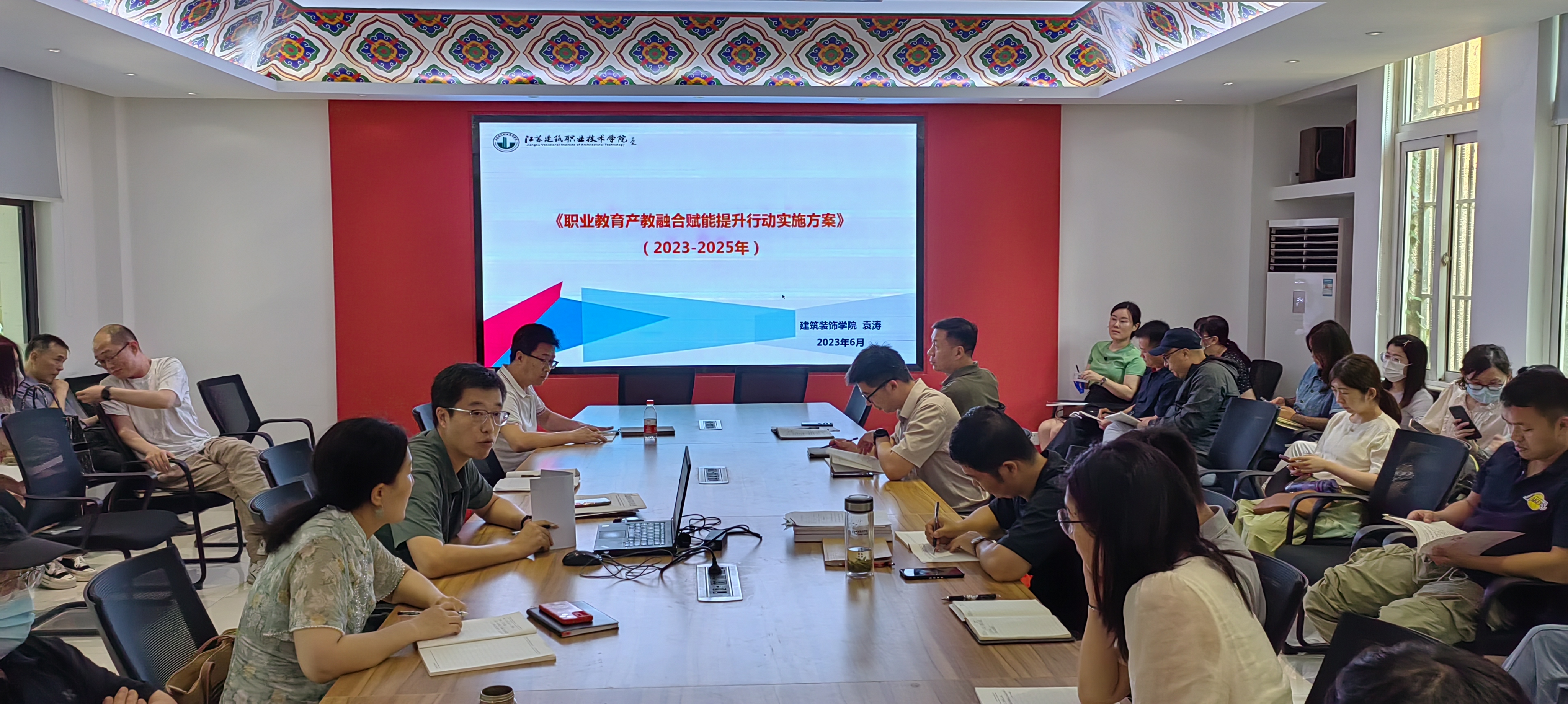 6月27日下午,建筑装饰公司党总支开展主题为《职业教育产教融合赋能提升行动实施方案(2023-2035年)》的教职工政治理论学习,建筑装饰公司经理袁涛主讲,公司全体党员教师参加会议。