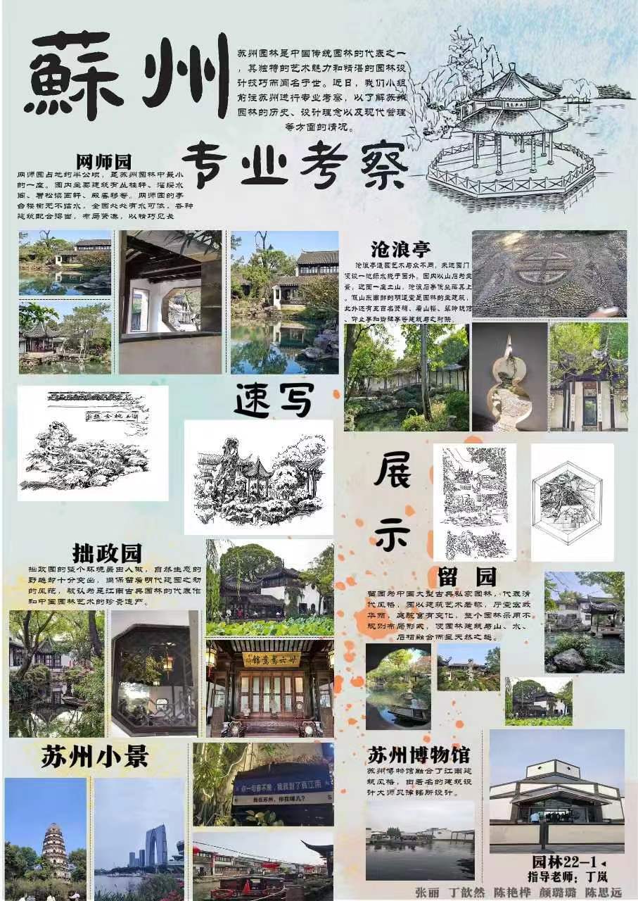 根据公司园林工程技术专业教学进度安排,2023年10月23日至10月28日,专业考察由丁岚、吴小青教师带队指导,园林工程技术专业2022级两个班五十余名同学赴苏州顺利完成了专业考察教学活动,并在太阳成集团tyc522cc举办了专业考察课程成果汇报展。