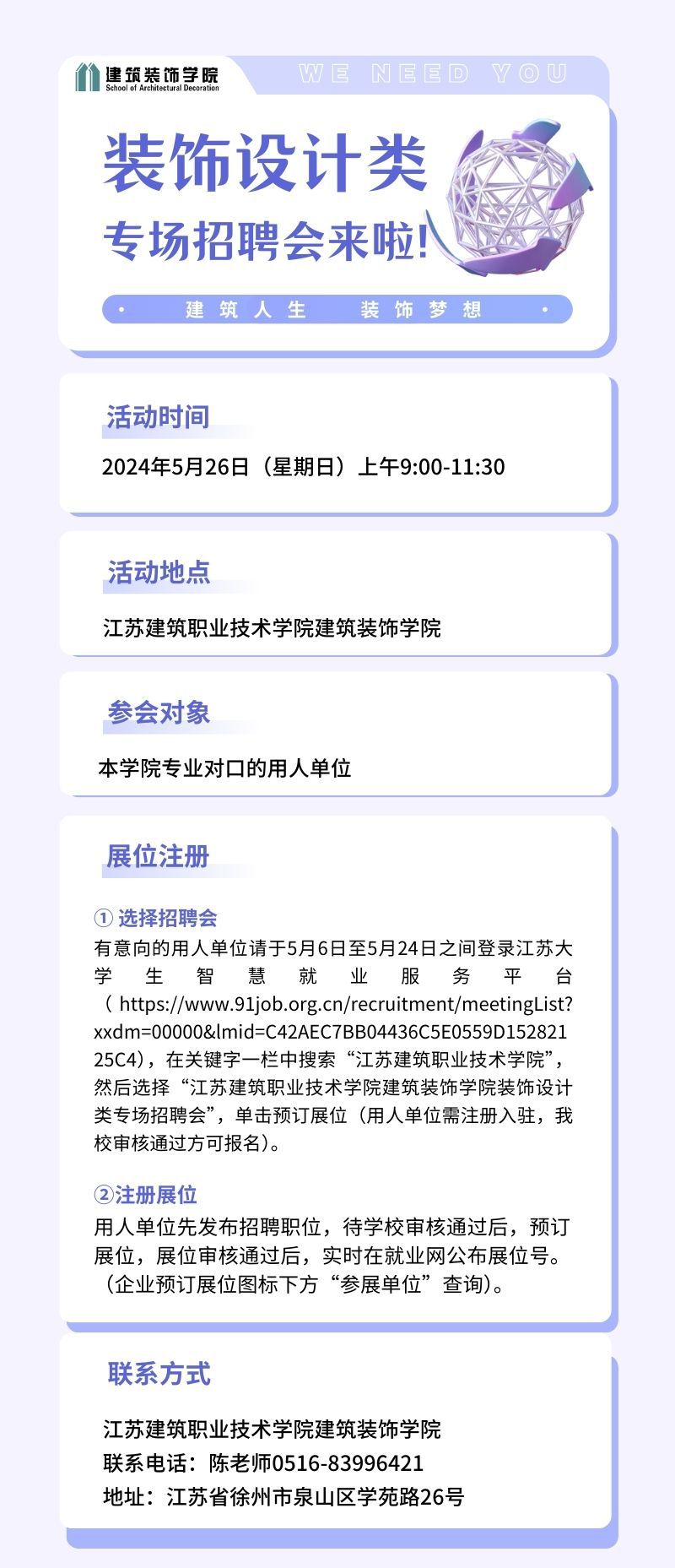 1.有意向的用人单位请于5月6日至5月24日之间登录江苏老员工智慧就业服务平台(https://www.91job.org.cn/recruitment/meetingList?xxdm=00000&lmid=C42AEC7BB04436C5E0559D15282125C4),在关键字一栏中搜索“tyc522cc太阳成集团”,然后选择“tyc522cc太阳成集团太阳成集团tyc522cc装饰设计类专场招聘会”,单击预订展位(用人单位需注册入驻,公司审核通过方可报名)。
