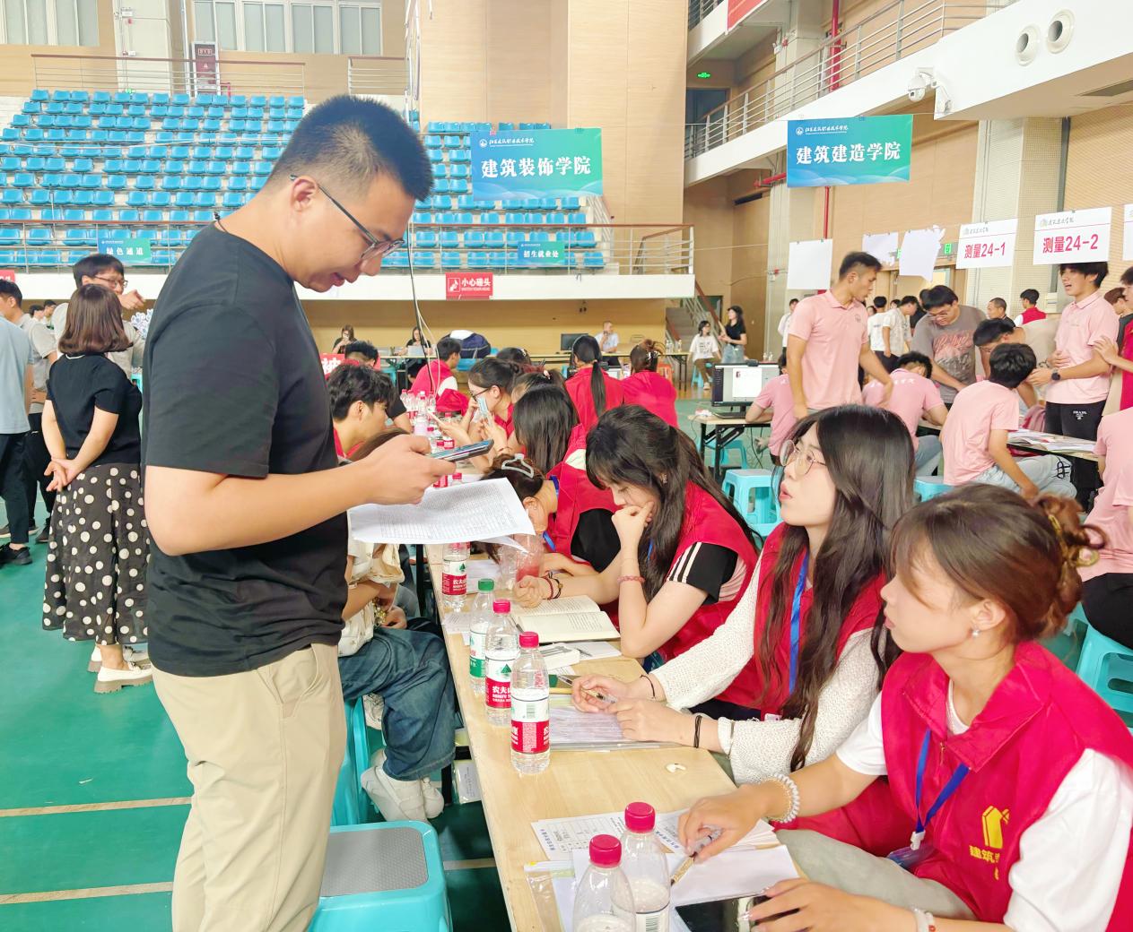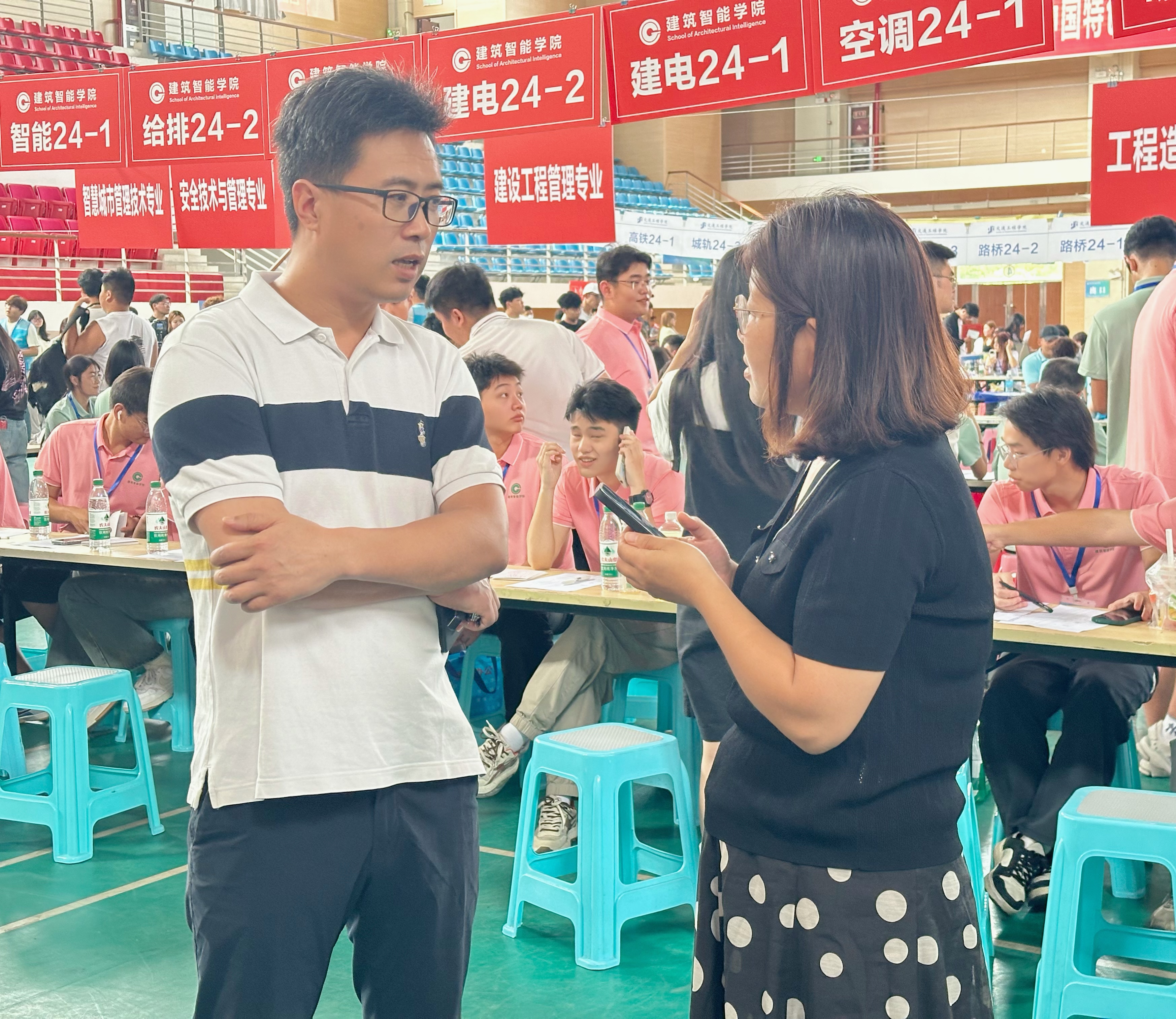 为扎实做好新生入学教育,迎新工作期间,公司党总支书记娄志刚等院领导一行来到体育馆迎新注册报到点看望新生及公司迎新工作人员,同公司师生亲切交流。