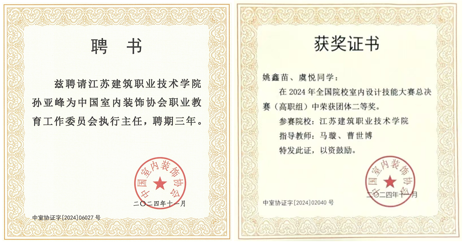 在2024年全国院校室内设计技能大赛总决赛中,公司室内艺术设计专业姚鑫苗、虞悦组成的团队(指导老师:马璇、曹世博)荣获团队二等奖。大会同期举办了室内设计教育云平台体验展、第十五届中国国际室内设计双年展、全国院校室内设计技能大赛系列成果展、2023年教育部职业院校艺术设计类专业教学指导委员会全国职业院校艺术设计类优秀作品展暨产教融合成果转化对接会等活动。
