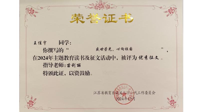 近日,江苏省教育系统关心下一代工作委员会公布2024主题教育读书征文活动评选结果,我关工委选送的作品盛世荣光,心向祖国》(作者:建设22-2班王佳宇,指导:苗利丽被评为优秀征文