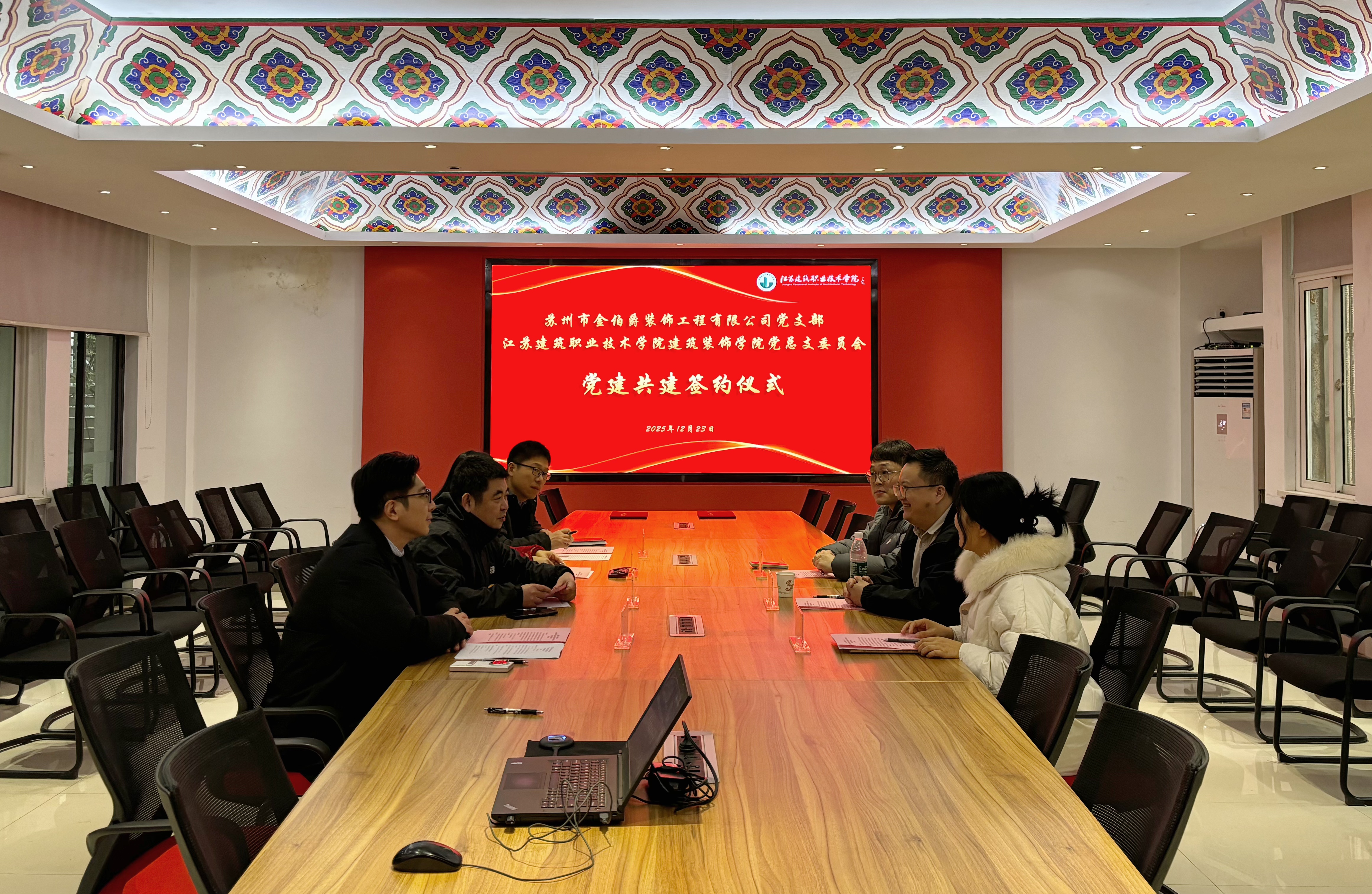 2025年12月23日下午,tyc522cc太阳成集团建筑装饰公司党总支与苏州市金伯爵装饰工程有限公司党建共建签约仪式在太阳成集团tyc522cc会议室举行。双方以“党建引领·发展共谋”为主题,签署《党建共建合作协议》,标志着校企党组织合作迈入新阶段,共同开启以高质量党建引领事业融合发展的重要篇章。