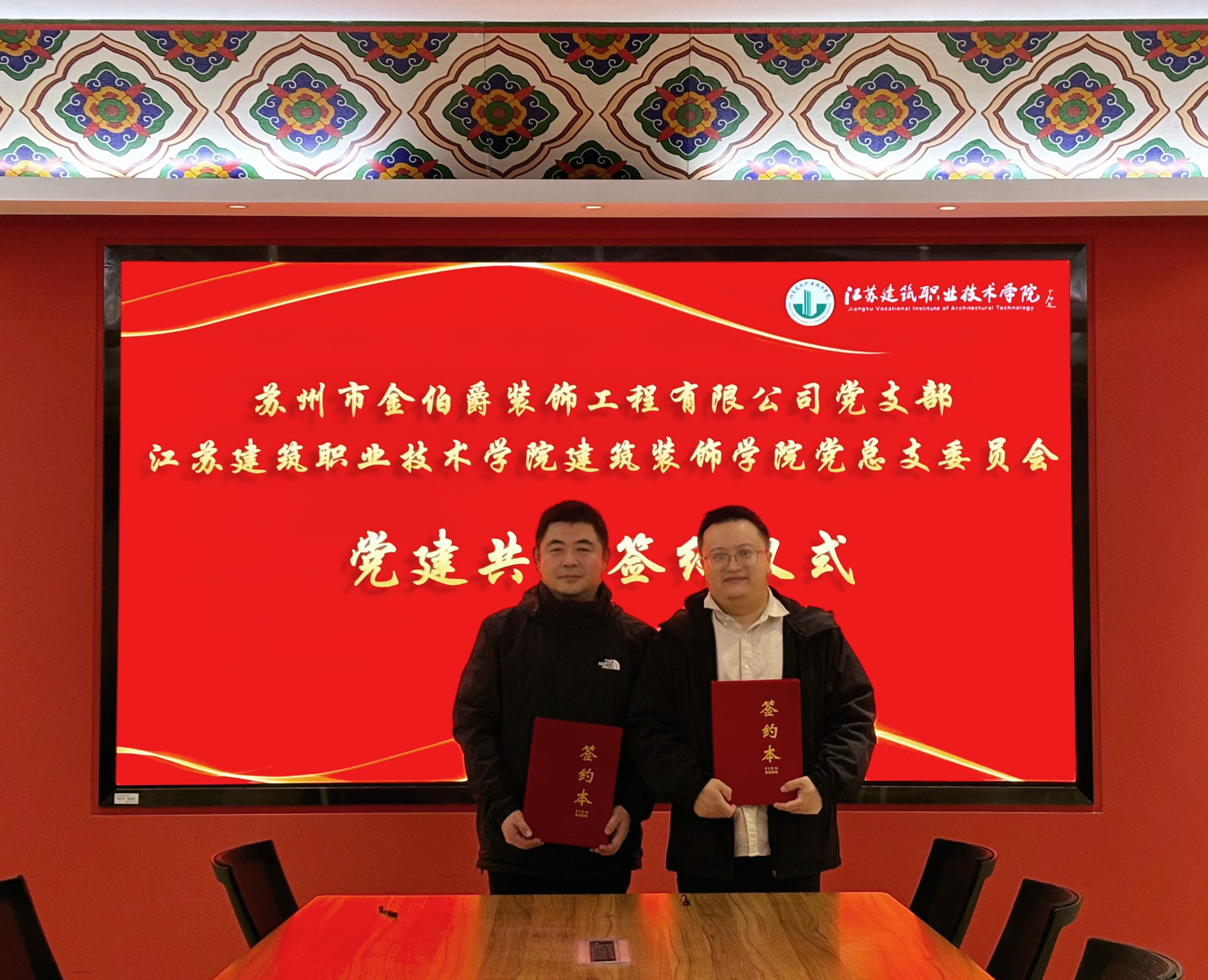 签约仪式由建筑装饰公司党总支副书记石峰主持。公司党总支书记王正扬、经理王峰、副经理翟胜增,古建筑工程技术专业群教工党支部书记于琍、建筑装饰工程技术专业群教工党支部书记蓝亦睿;苏州市金伯爵装饰工程有限公司宣传部与劳务部经理李康康等双方代表出席活动。