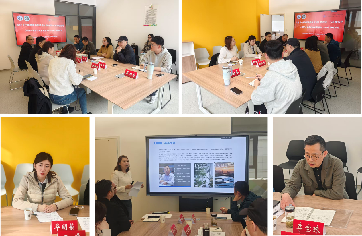 座谈会在装配化装修协同创新中心会议室举行,王峰经理介绍公司发展历程与校企合作情况;孙亚峰教授围绕建筑装饰行业转型升级、装配化装修人才需求、专业建设、能力图谱开发、人才培养体系构建、产教融合共同体和技能大赛等作了系统分享;李宝珠会长了介绍协会工作与校企合作实践;毕明荣副总编介绍了杂志社基本情况与协会工作重点,并就行业标准化建设、市场化推广与社会培训等方向进行展望。随后,各方围绕建筑装饰行业现状与瓶颈、城市更新背景下的发展前景、产业技术创新、行业标准制定、产业工人培训、校会企协同合作及报告编撰等议题深入交流。