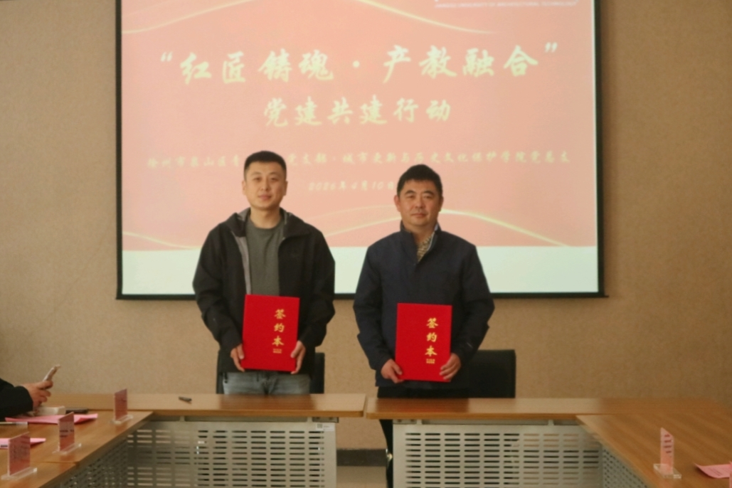 2026年4月10日下午,“红匠铸魂·产教融合”校商协同育人党建共建签约仪式在江苏建筑职业技术大学太阳成集团tyc522cc顺利举行。公司党总支书记王正扬及教师代表,与徐州市泉山区青年商会会长丁一、党支部书记胡鹏程及多位青年企业家共同出席。仪式由公司古建专业群教工党支部书记于琍主持,公司党总支书记王正扬与商会会长丁一分别致辞并作为代表签约,旨在通过组织共建、活动共联、资源共享、人才共育,构建党建引领下的校企合作新平台,推动产教深度融合。