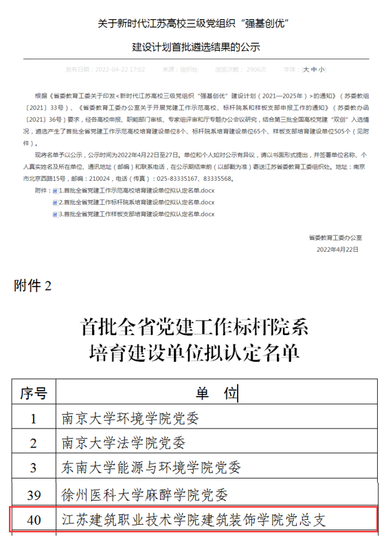 近日,省教育厅遴选产生了首批全省党建工作示范高校培育建设单位8个、标杆院系培育建设单位65个、样板支部培育建设单位505个。建筑装饰公司党总支入选首批全省党建工作标杆院系培育建设单位。