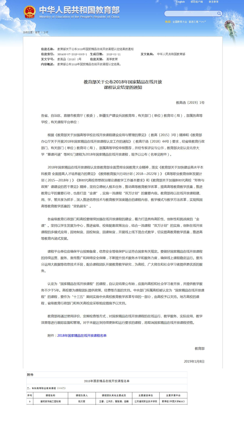 18日,教育部发布了《关于公布2018年国家精品在线开放课程认定结果的通知》(教高函【20191号),公司陆文莺老师主持的《建筑装饰施工图绘制》课程认定为2018年国家精品在线开放课程。